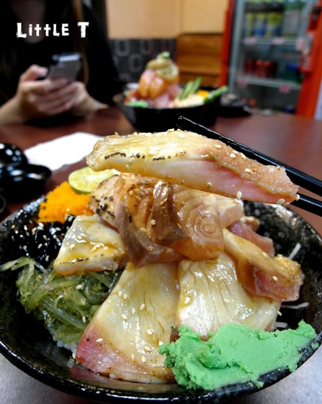 這碗炙燒生魚片丼裡面有旗魚、鮭魚、海鱺,配菜的話則跟其他一樣